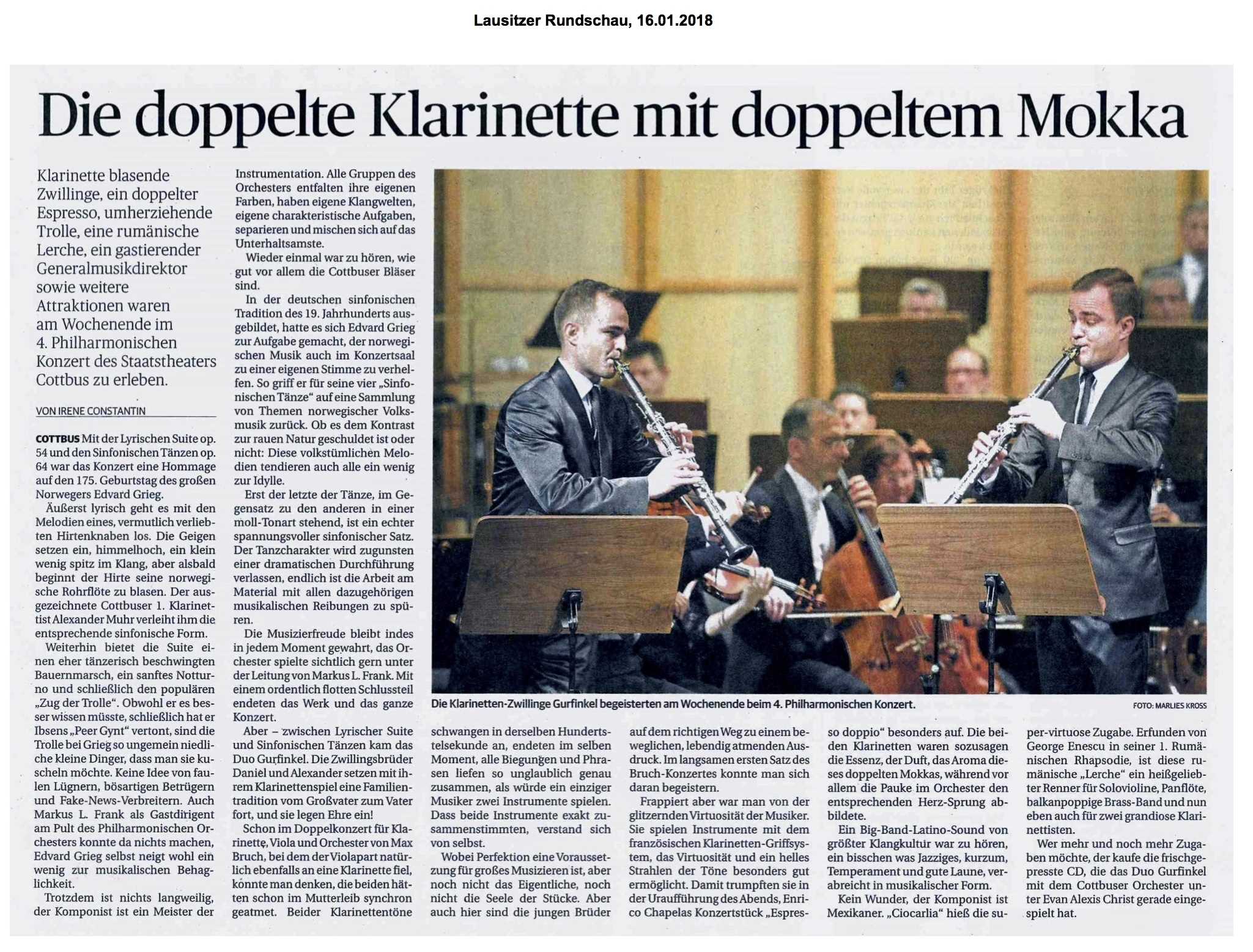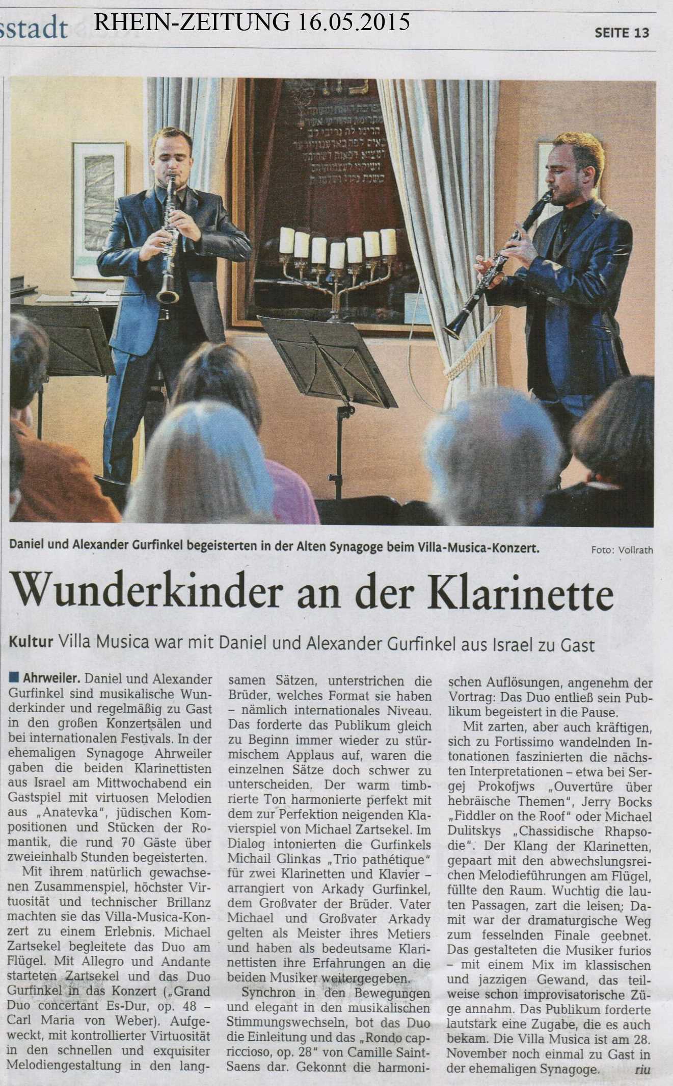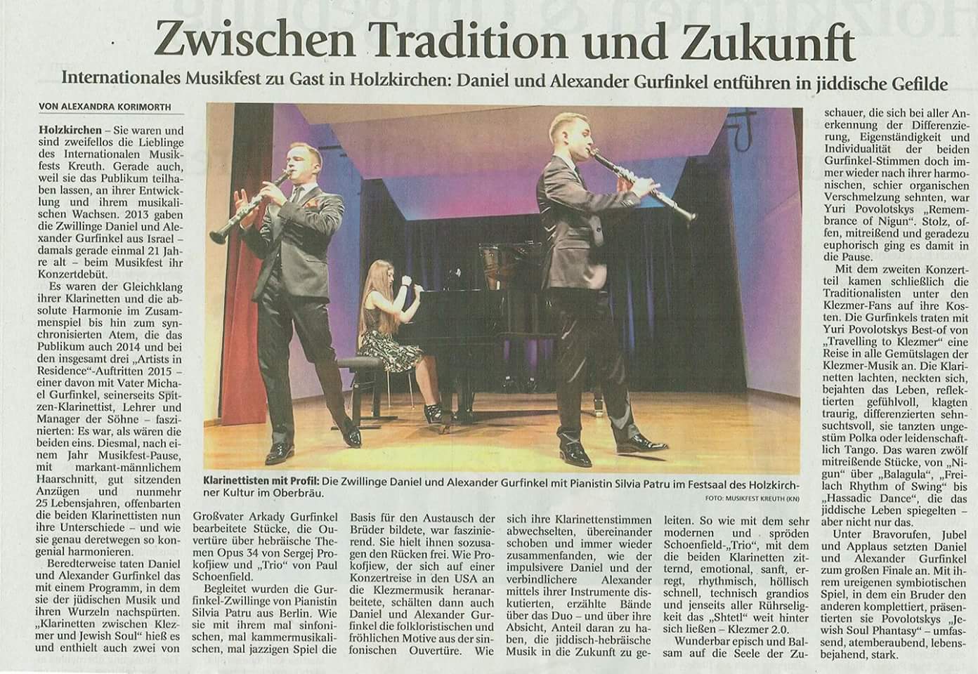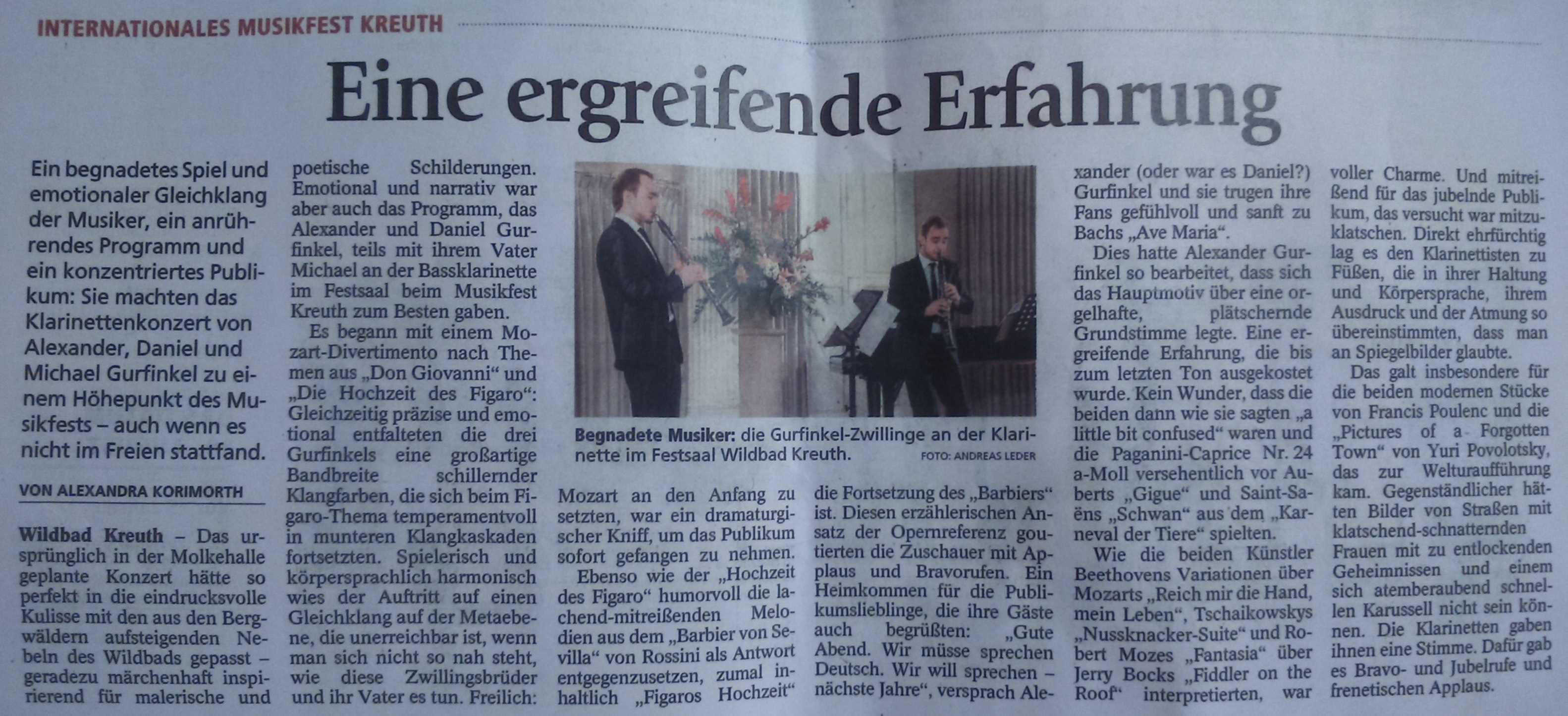 - ..."The Matinee on Sunday brought two surprises: the Slovenian Philharmonic Orchestra, and the Israeli Clarinetists Daniel and Alexander Gurfinkel. The twins, only 17 years young, have all one would wish for in terms of technique and musicianship. They differentiated beautifully and subtly in such diverse pieces as Mendelssohn’s “Konzertstück” op. 114 and Gershwin’s “Rhapsody in Blue”...