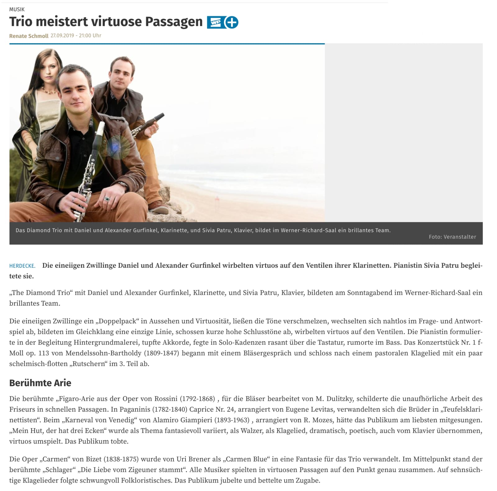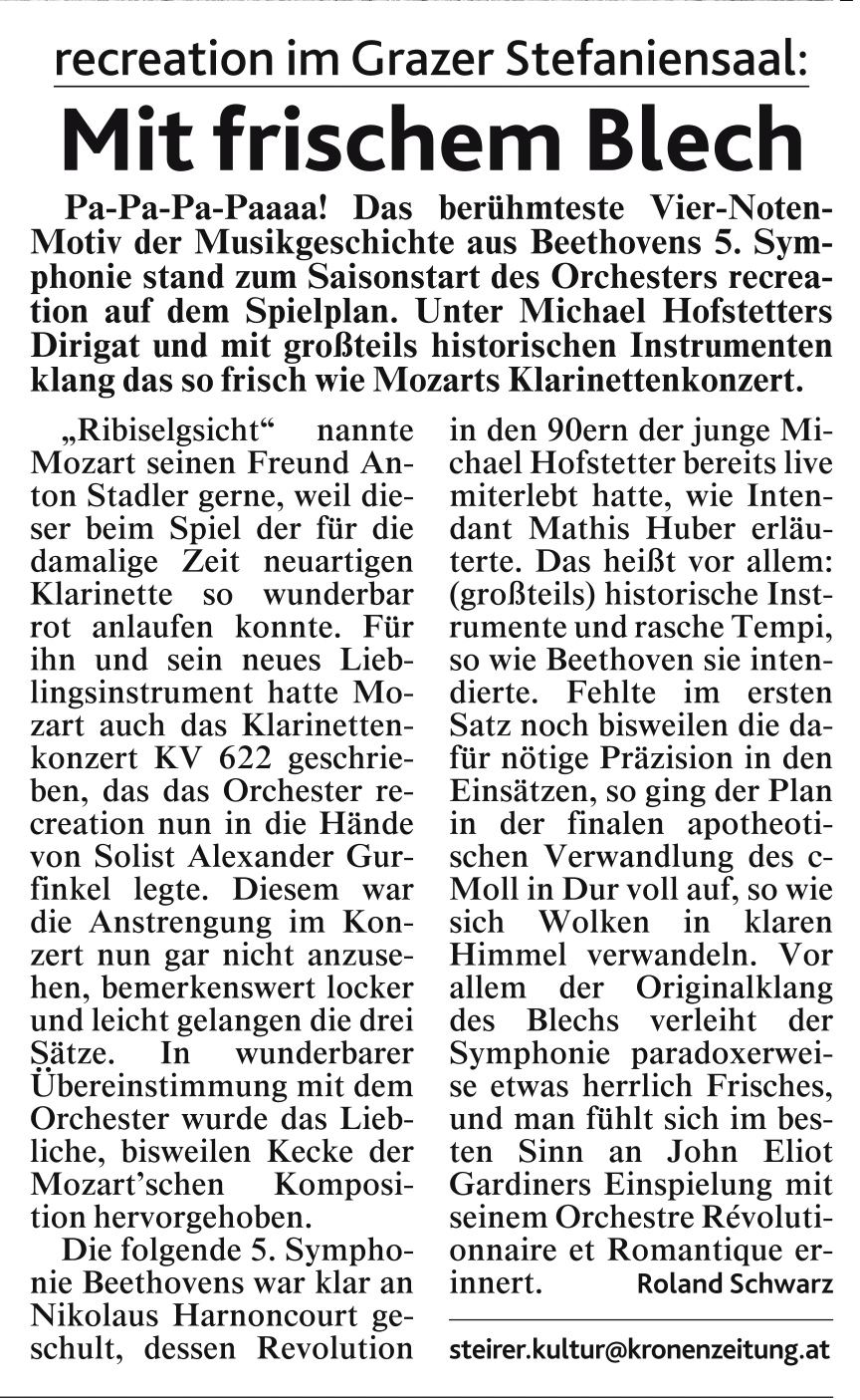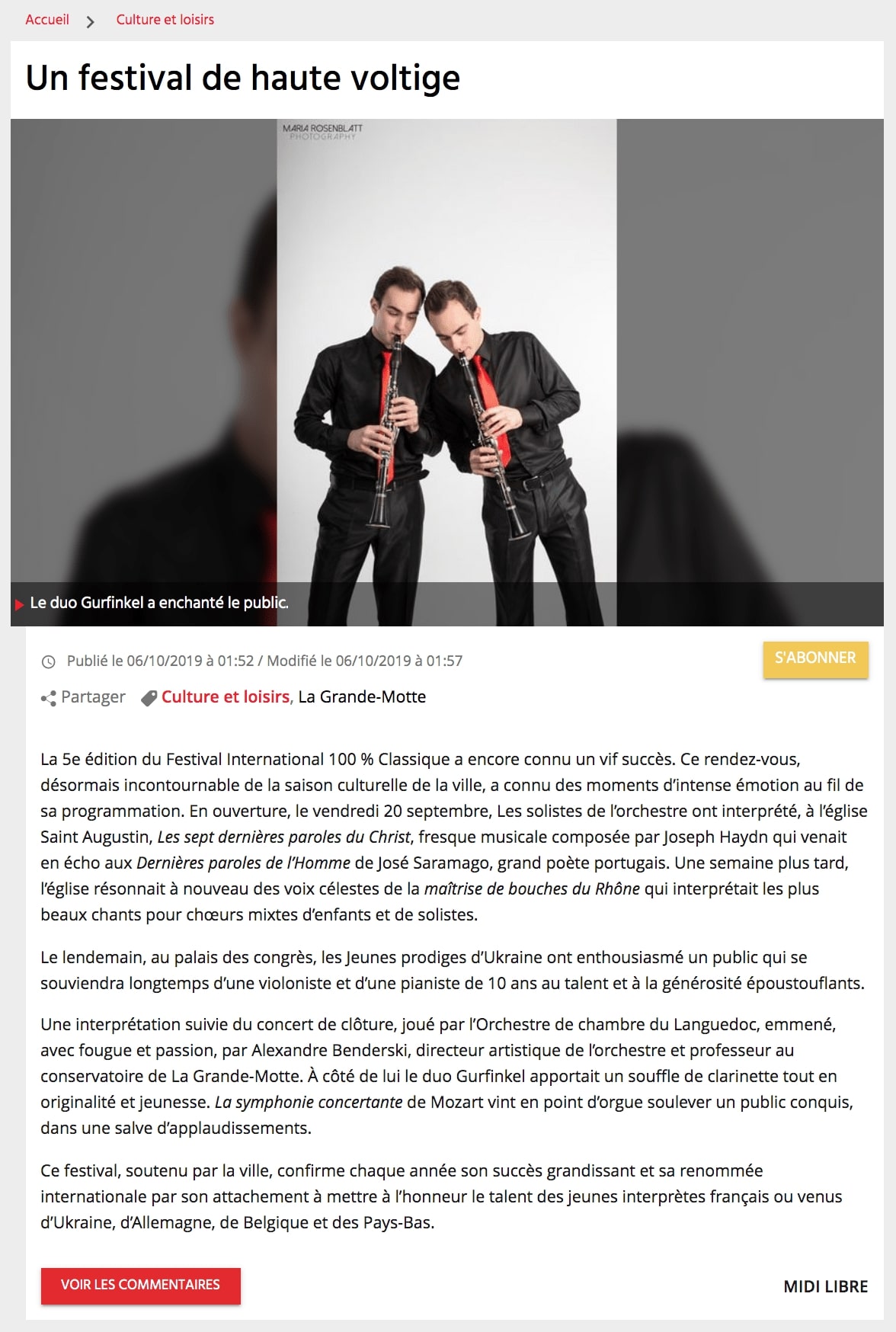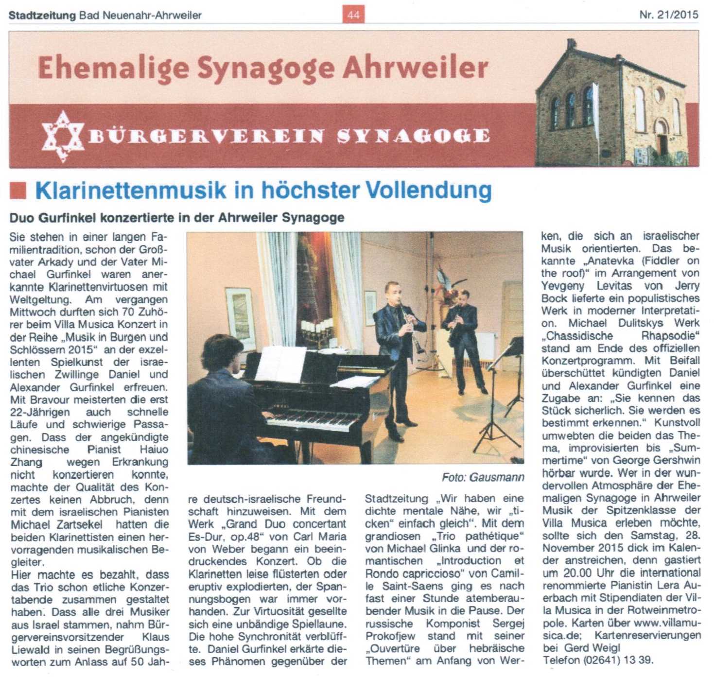 - ..."The Matinee on Sunday brought two surprises: the Slovenian Philharmonic Orchestra, and the Israeli Clarinetists Daniel and Alexander Gurfinkel. The twins, only 17 years young, have all one would wish for in terms of technique and musicianship. They differentiated beautifully and subtly in such diverse pieces as Mendelssohn’s “Konzertstück” op. 114 and Gershwin’s “Rhapsody in Blue”...